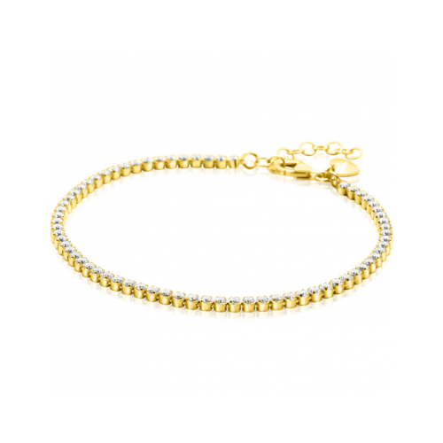ZINZI gold plated zilveren tennis armband (2,5mm breed) bezet met witte zirconia's in ronde kastzettingen. De lengte van de armband is te variëren tussen 17-20 cm. Vervaardigd van eerste gehalte zilver (925) en extra geel verguld.
