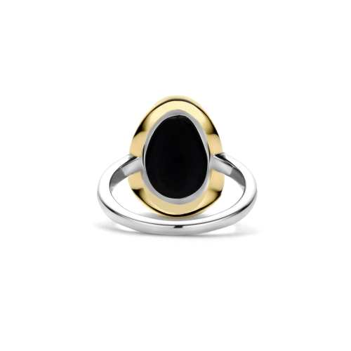 Ontdek middernachtelijke allure met deze TI SENTO goudkleurig vergulde zilveren ring 12386BY. Gevormd uit 925 sterling zilver en afgewerkt met een spiegelend platinakleurig laagje, leidt de slanke band het oog naar een organisch gevormde, diepzwarte steen waarvan het gefacetteerde ƒ?opebbleƒ??-oppervlak subtiel licht weerkaatst. Een gladde goudkleurig vergulde rand omlijst de edelsteen, terwijl een taps toelopende rij van pavé-gezette witte cubic zirconia langs één zijde een verfijnde sprankeling toevoegt zonder het geheel te overheersen. Draag de ring solo voor krachtig contrast, of stapel hem met slanke metallic ringen om een zorgvuldig samengestelde glans te creëren. Nikkelvrij en hypoallergeen, dit sieraad blijft de hele dag huidvriendelijk.