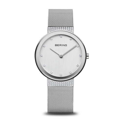 Dit dameshorloge belichaamt de essentie van arctische helderheid: compromisloze eenvoud, strakke lijnen en een verrassend expressief karakter. De geborstelde zilverkleurige wijzerplaat vangt het licht als ijs onder de poolzon. Subtiele Swarovski-kristallen markeren de uren ƒ?" verfijnd en fonkelend als sneeuw in het zonlicht.