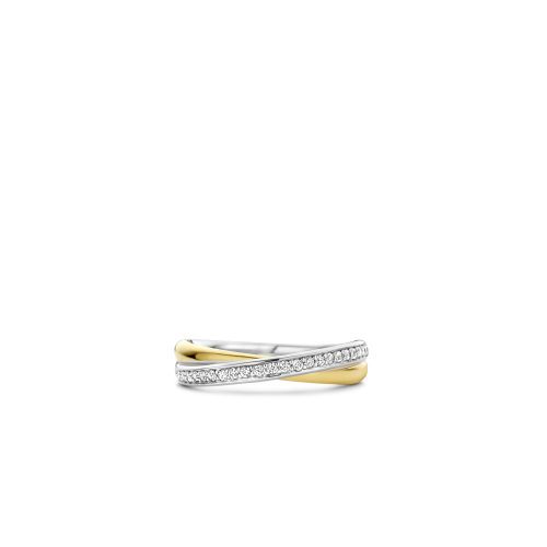 Deze TI SENTO û Milano zilveren ring 1953ZY bestaat uit twee sierlijke banden, waarvan met een handgezet pavÚ van witte cubic zirconia steentjes en de ander met een glad gold-plated oppervlak. De ring is gemaakt van 925 sterling zilver en plated met 18k geelgoud. Draag dit verfijnde pronkstuk helemaal hoe jij het wilt, bijvoorbeeld solo of tussen verschillende stapelringen voor een speelse look.