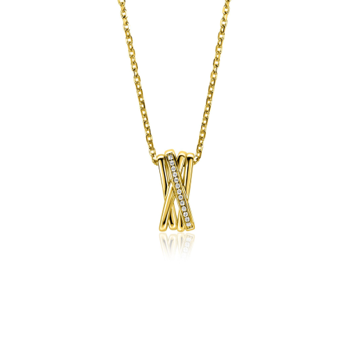 ZINZI gold plated zilveren ketting (42ƒ?"45cm) met cross-over hanger 16mm, bezet met witte zirkonia's. De ketting is vervaardigd van eerste gehalte zilver (925) en extra geel verguld.| General | |