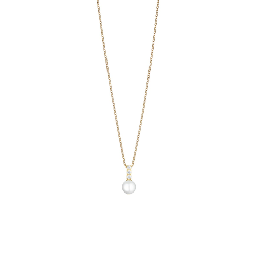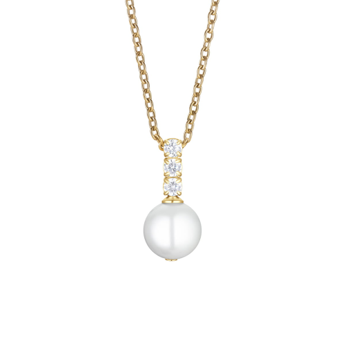 De 456-27-500 ketting bestaat uit een fijne goudkleurige schakelketting met een elegant hangertje: drie fonkelende kristallen lopen over in een perfect ronde, glanzende parel.
