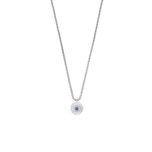 De 465-179-450 ketting straalt elegantie en frisheid uit. De ronde hanger met zonnestraalstructuur symboliseert licht, rust en harmonie. In het midden schittert een blauwe kristal, omringd door kleine heldere steentjes die het licht prachtig weerkaatsen.